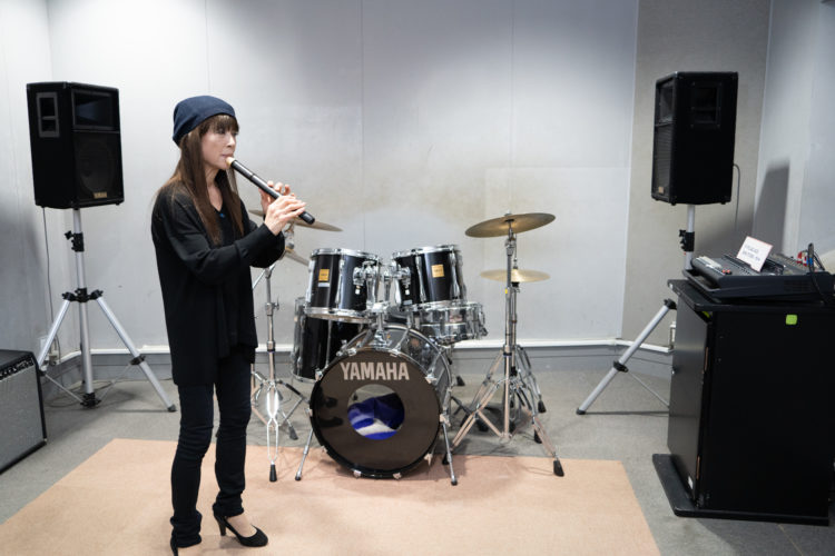 「音楽工房」でケーナを練習する村上悦子さん。緑園都市駅の自宅からは通いやすく、安全で清潔な環境も気に入っています