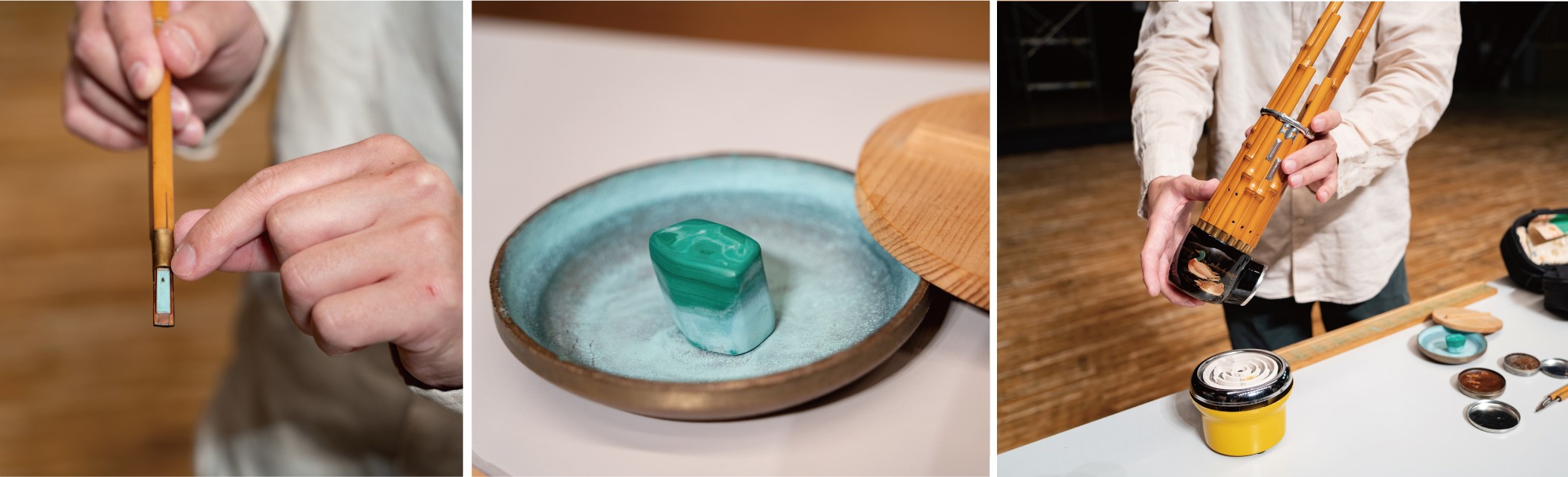 写真左・中:計17本の竹管のうち15本には下端の根継(ねつぎ)部分に金属製の簧(した=リード)がついており、リードには孔雀石(マラカイト)の粉末を水に溶いたものが塗ってあります