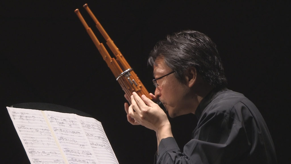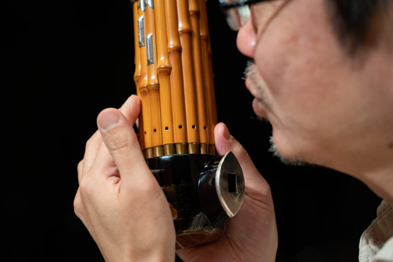 真鍋さんが合奏の中で演奏しているのは笙という管楽器です。17本の竹管に金属製のリードがついた円筒状の楽器で、神秘的で美しい重音を響かせます。ハーモニカと同じように吹いても吸っても音が出るため、音を途切らせることなく演奏することが可能です。