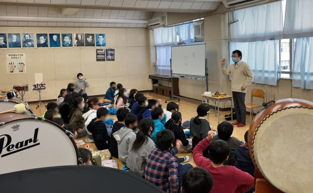 *2020年に行われた区内の小学校でのワークショップ。手を動かして鞨鼓や太鼓のリズムを感じます