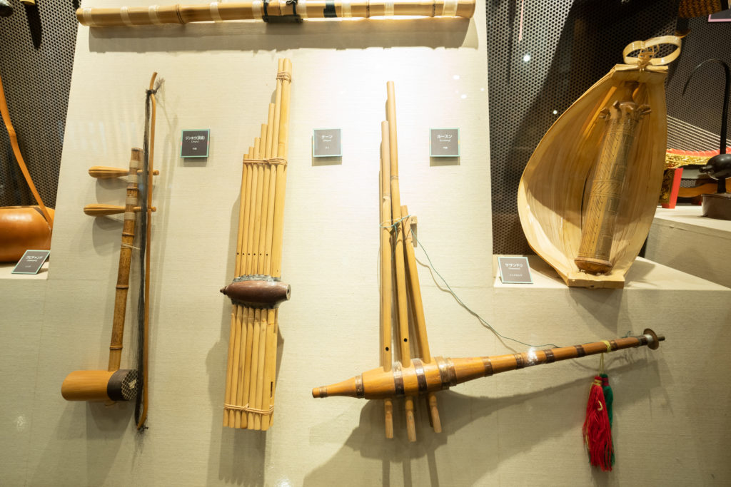 馬頭琴など、学校で教えてもらったことがある楽器から、初めて目にするような楽器まで、はじく・こする楽器、ふく楽器、たたく楽器などに分けられ、約40種類の楽器が展示されています。