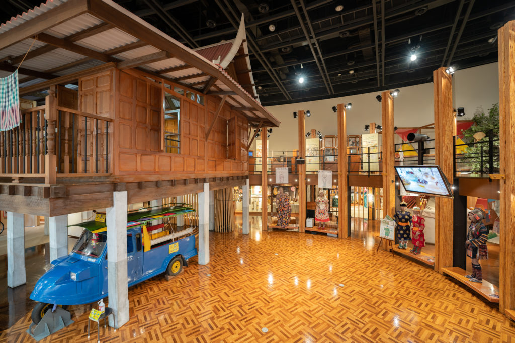 ここは、人々の衣食住や仕事、心の表現を通して、世界の人々の暮らしや文化を知ることができる展示室です。広々としたスペースに、再現家屋、乗り物や衣装、生活道具、楽器などが展示されていて、実際に触れるなどして体験しながら学べるようになっています。