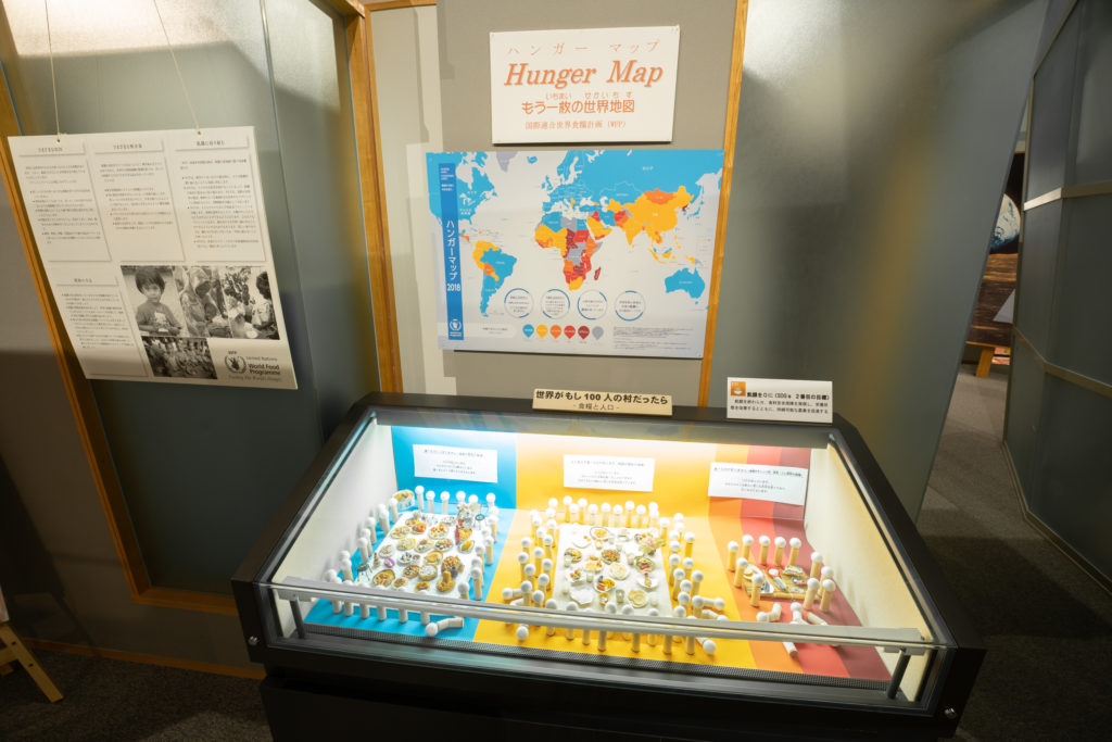 世界の食糧事情について、栄養不足人口が色分けで示されたハンガーマップと、「世界がもし100人の村だったら」を表現した模型です