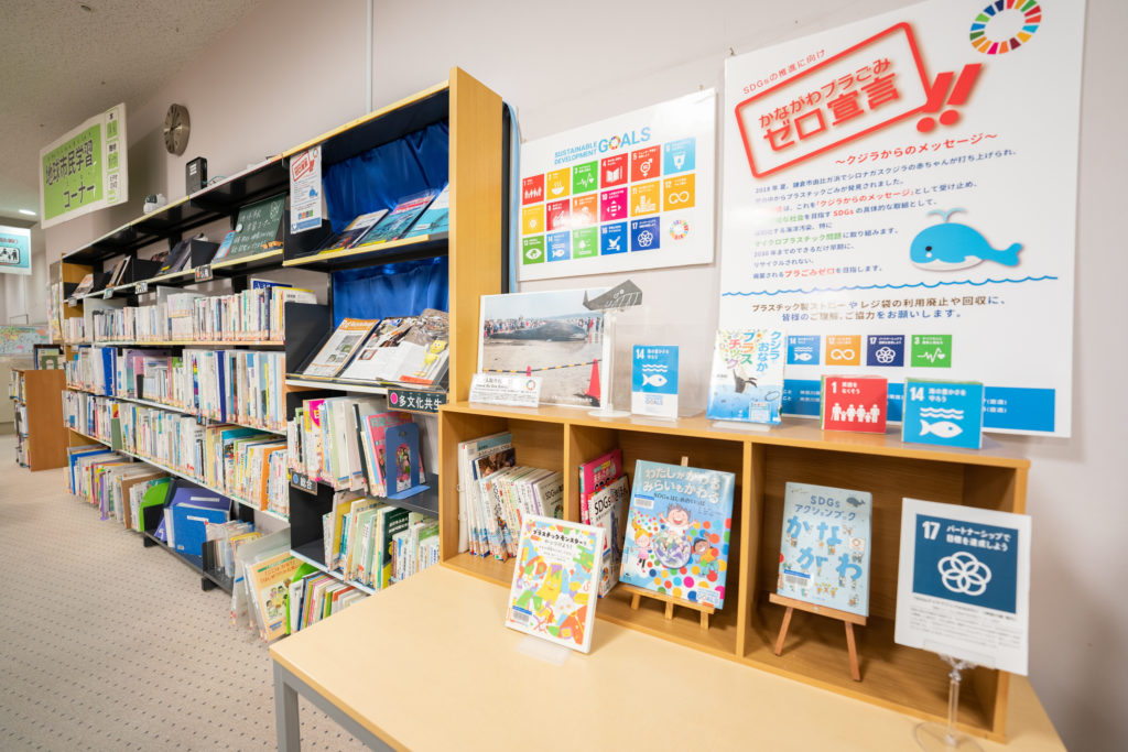このSDGsコーナーでは、特に神奈川県が推進している「かながわプラごみゼロ宣言」にも繋がるような、プラスティックゴミ問題や、その問題解決のための行動について書かれた本が紹介されていました。私たちの身近では、プラスチックごみを出さないために、エコバッグやマイボトルの持参といったこともSDGsの取り組みの一つですね。