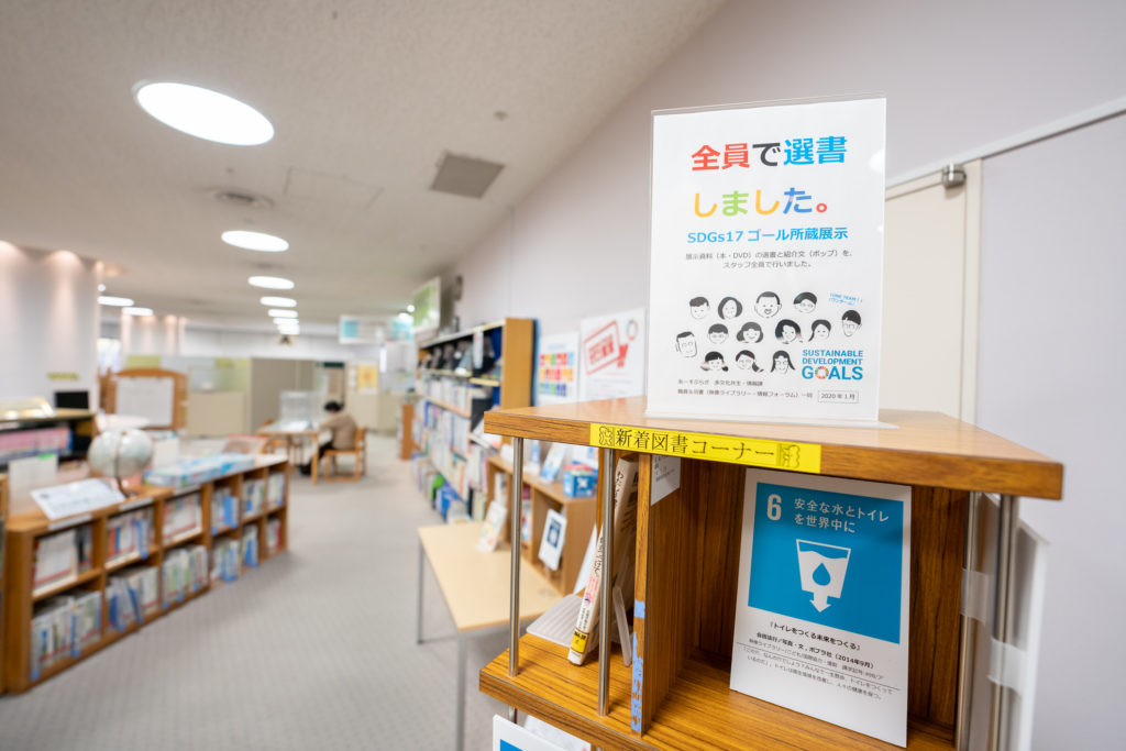 「SDGs 17ゴール所蔵展示」として、職員1人が1ゴールを担当し、所蔵されている書籍や資料から選書したものが紹介されていました