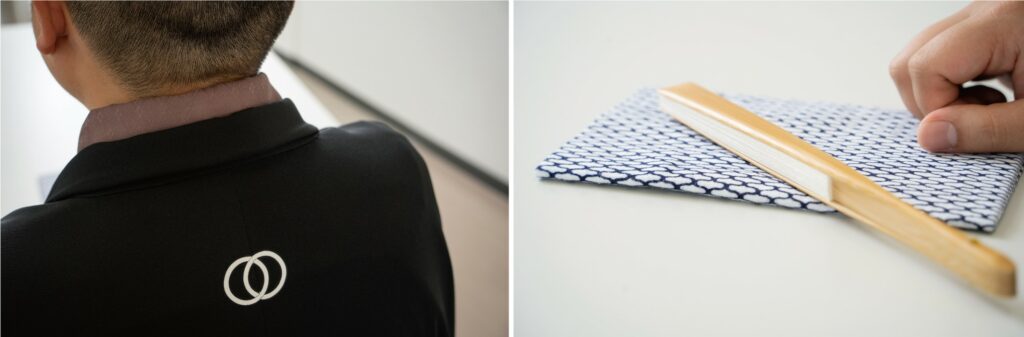 写真左:鯉丸さんの羽織には、ご実家の紋「輪違い」が入っています