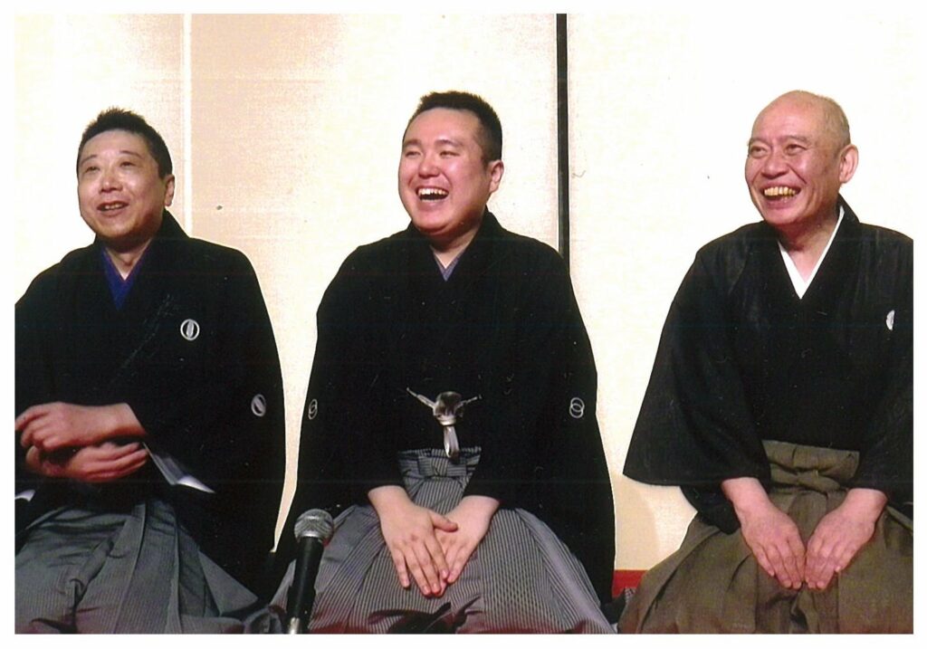 *2015年、横浜にぎわい座「のげシャーレ」で開催された、鯉丸さんの二ツ目昇進披露公演。左から兄弟子の春風亭柳若さん、鯉丸さん、師匠の瀧川鯉昇さん。鯉昇一門は皆、落語芸術協会に所属する落語家。落語界には協会・流派があり、東京は、落語協会・落語芸術協会・落語立川流(立川流)・五代目円楽一門会(円楽党)の4つ、関西は上方落語協会が存在する