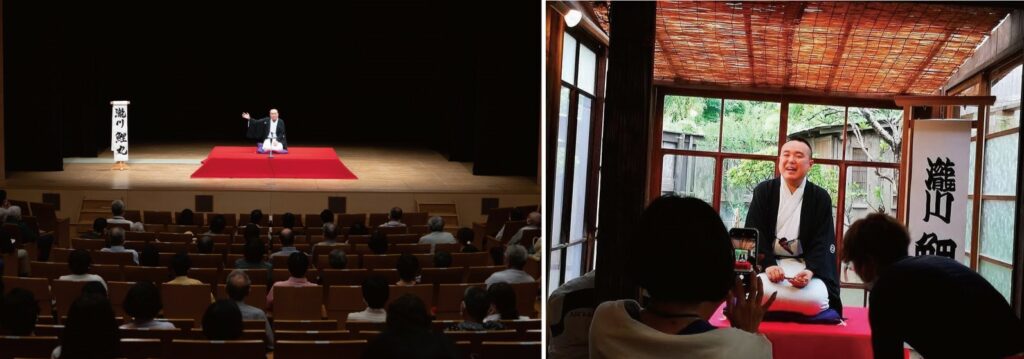 落語は、浅草演芸ホール、新宿末廣亭といった「落語定席」と呼ばれる寄席のほか、コンサートや芝居が行われるホールやカフェなどでも演じられる。左の写真はみどりアートパーク、右の写真(*)は葉山のカフェでの落語会の様子