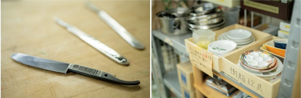 写真左はさまざまな形をしたメス。筆致を成形したり、細かな箇所の汚れ除去などに使います。写真右は補彩に使う道具です