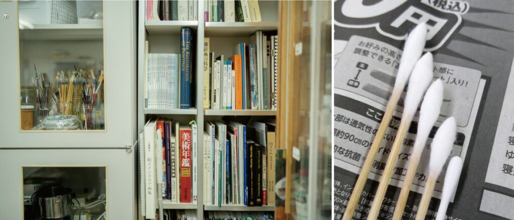 アトリエ内には修復に使用するさまざまな道具や、参考書籍などが並んでいます。*写真右は手作りの掃除用の綿棒。綿棒は基本的に手製のものを使っています