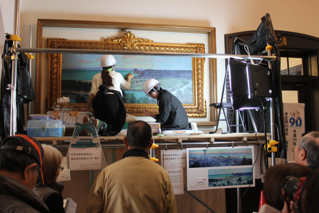 *横浜市開港記念会館にある和田英作の油彩画「開港前の横浜村」の修復は、「公開修復」という形を取りました。絵画を保存していく重要性を伝えるための取り組みの一つです