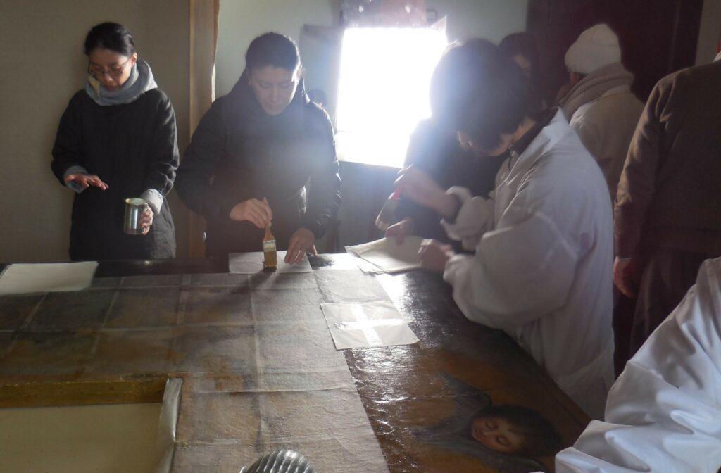 「絵具が欠損していた場合には、まず今以上に絵具が剥離しないよう、糊の役目をする膠(にかわ)で剥離止めを行います。奈良県五條市で、日本の伝統的な方法で作られた鹿の膠を使っています。さらに、絵を傷つけないよう和紙で表打ちをします。いま世界中の修復の現場で和紙が使われているのですが、これは1966年のイタリア・フィレンツェのアルノ川の洪水後の美術レスキューで、日本から和紙を送ったことがきっかけで世界に広まったと言われています。紙を剥がす時に絵が剥がれてしまうのを防ぐためにも和紙を使うことが好ましいです」