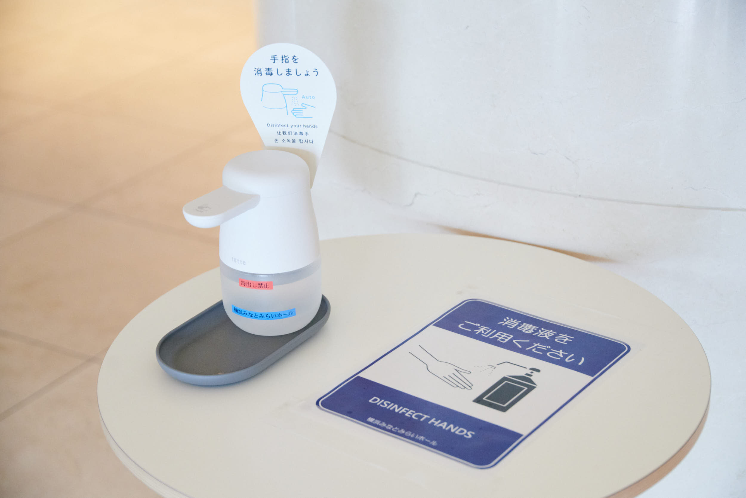 消毒液はエントランスの他、各階のホワイエや楽屋口など、複数設置されていました。